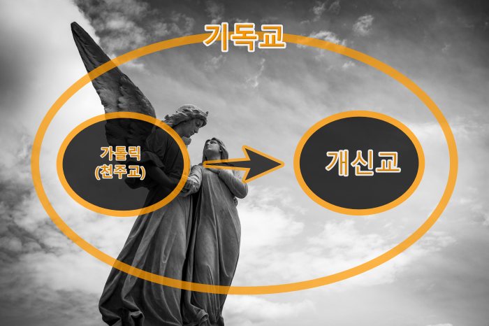 기독교, 가톨릭, 개신교를 표로 그리면 아래와 같습니다. 가톨릭은 개신교로 옮겨간 것은 아닙니다. 아직도 존재하고 성당이라고 부르는 곳이 가톨릭교회입니다. 일반 교회는 개신교를 뜻합니다.